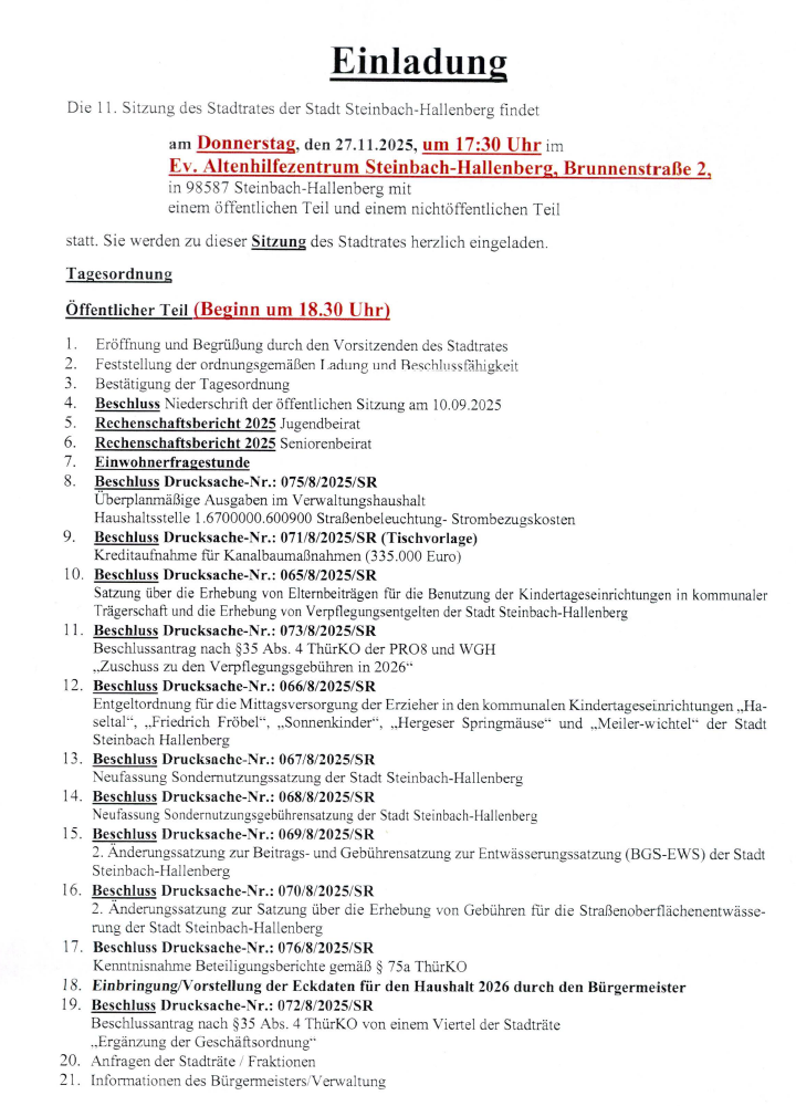 Schwerpunkte der 11. Sitzung des Stadtrat der Stadt Steinbach-Hallenberg sind Rechenschaftsberichte, Beteiligungsberichte, Änderungen von Satzungen und die Einbringung des Haushaltes für das Jahr 2026