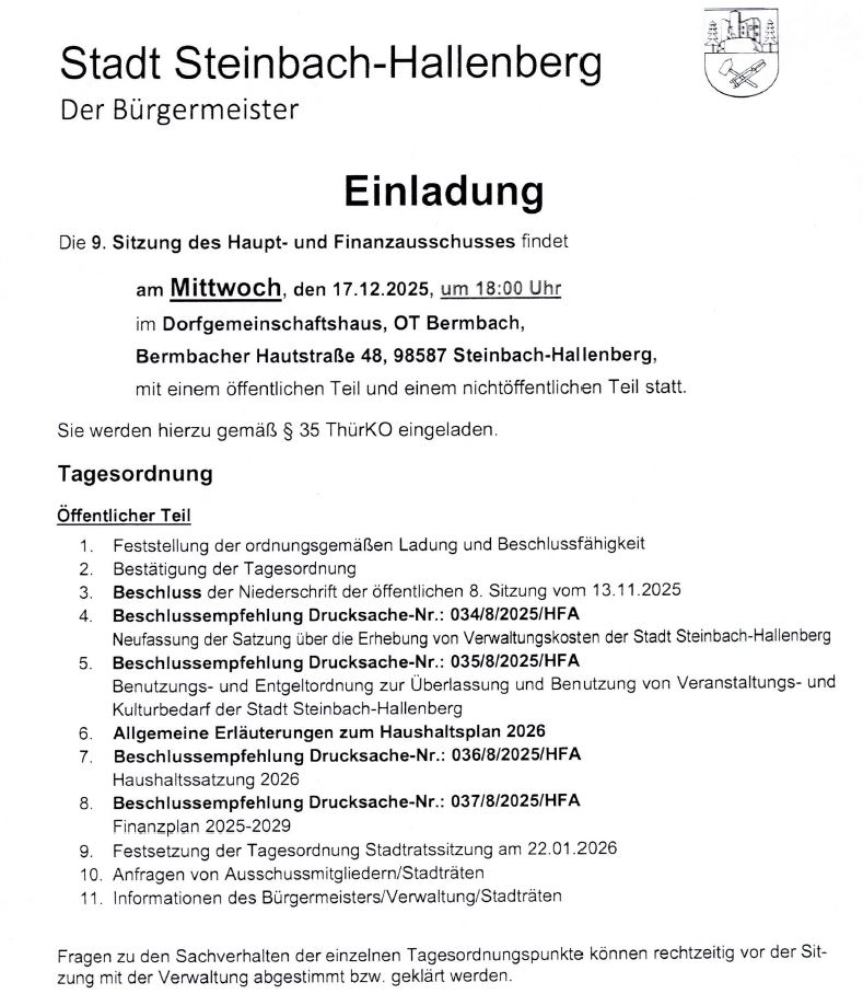 Sitzung des Haupt- und Finanzausschuss 17.12.2025Von Stefan Bühner / 17. Dezember 2025 9. Sitzung des Haupt- und Finanzausschuss der Stadt Steinbach-Hallenberg Mittwoch, 17.12.2025 – 18 Uhr – Dorfgemeinschaftshaus Bermbach